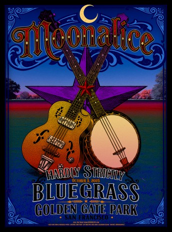 According to Moonalice legend, this is the 25th annual Hardly Strictly Bluegrass. Moonalice has played at 16 of them, which covers all but two years since Moonalice first started. Today’s poster by Carolyn Ferris depicts Ribbit Moonalice, a special kind of frog who lives in Hellman Hollow. Special because Ribbit plays the banjo. Ribbit learned to play from Warren Hellman and he proudly carries on Warren’s legacy. Thank you to Jay Lane. Notes: Mookie Siegel played keys Jay Lane played drums alongside John Molo. Rachel Teitjen performed at this concert.