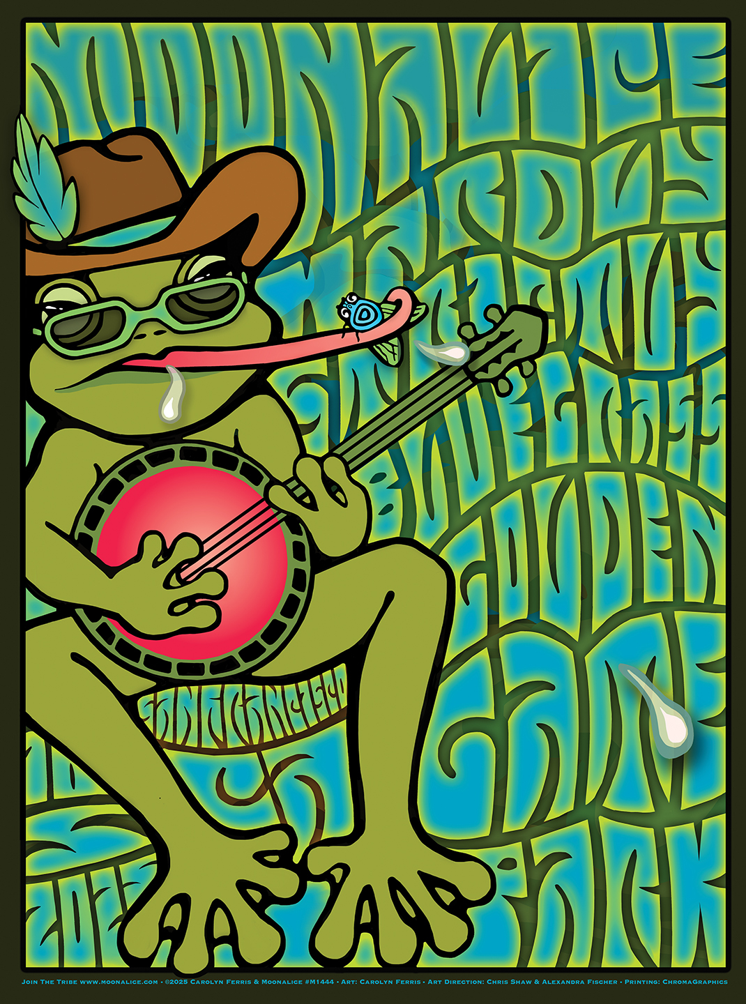 Today’s poster by Carolyn Ferris depicts Ribbit Moonalice, a special kind of frog who lives in Hellman Hollow. Special because Ribbit plays the banjo. Ribbit learned to play from Warren Hellman and he proudly carries on Warren’s legacy.